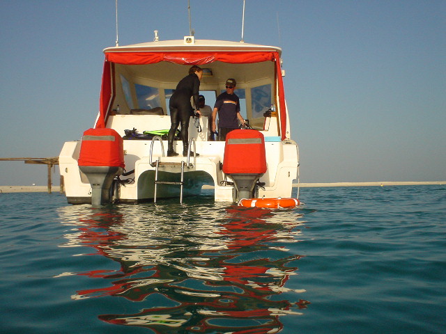 A 33 foot Catamaran is the latest addition to the QDive Marine Center. Outfitted with 2 250 Horsepower Yahama Marine outboards, this boat is ideal for diving and fishing in the waters of the Arabian Gulf. There are weekly trips (weather dependent) with options to either Southern or Northern Qatari waters for diving, snorkeling, and fishing activities. Daily trips are also available to the Banana and Safleya Islands. With a friendly crew, onboard shower, WC, Oxygen and Medical First Aid Kits, Global Positioning System, Fishfinder and Satellite Telephone Communications, QDive is able to provide a modern and safe way to enjoy the Qatari Waters. Contact QDive today to register for diving or fishing trips, arrange that family weekend on the water, or plan that special company outing!
